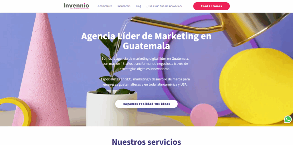 Invennio es una agencia de marketing digital en Guatemala que se especializa en transformar negocios a través de estrategias digitales innovadoras con marketing de contenidos. Con más de 15 años de experiencia, se enfocan en crear marcas, potenciar negocios e impulsar la presencia digital para empresas en Guatemala, Latinoamérica y Estados Unidos.