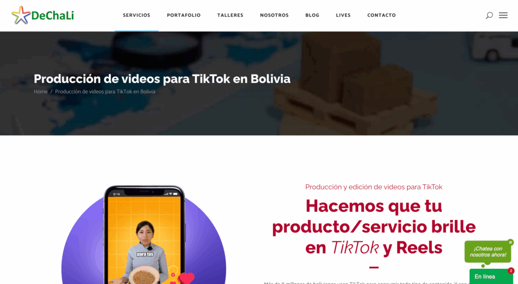 DeChaLi es una agencia de Marketing Digital y Desarrollo de Sistemas con sede en La Paz, Bolivia, que se enfoca en la Producción y Edición de Videos para TikTok y Reels. La agencia destaca la importancia de una estrategia sólida en TikTok, ya que no basta con subir videos, sino que se necesita un plan para convertir visualizaciones en ventas.