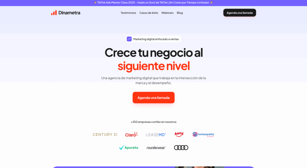 Dinametra es una agencia de TikTok que se especializa en la gestión de anuncios de extremo a extremo, desde la creación de videos hasta la generación de informes. Su principal propuesta de valor es enfocarse estrictamente en los resultados tangibles y no en métricas de vanidad como impresiones o clics.