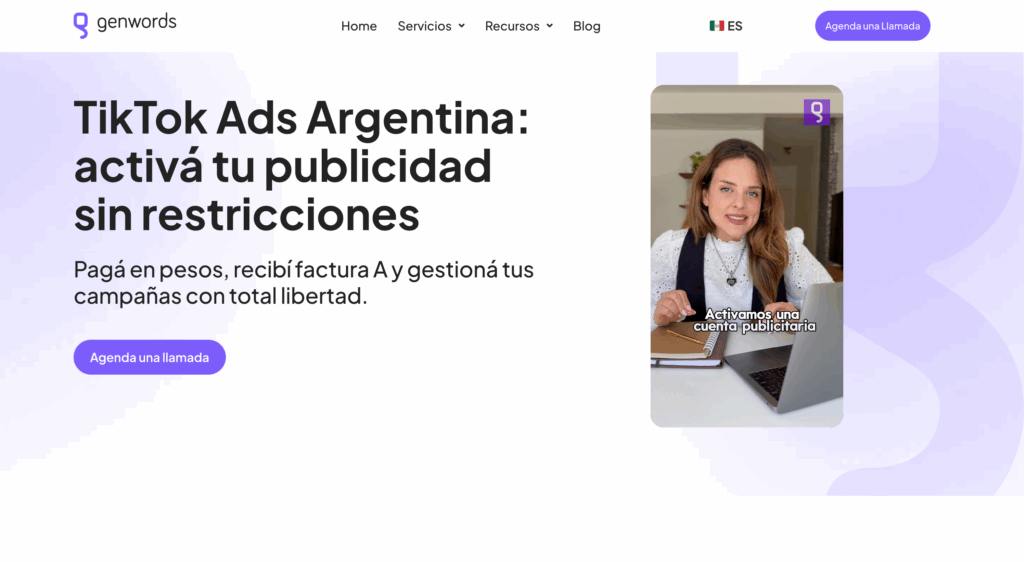 Genwords ofrece una solución especializada y única para el mercado argentino: TikTok Ads Argentina. Su principal propuesta de valor es resolver las restricciones de pago y gestión que enfrentan las empresas argentinas al intentar publicar directamente en TikTok Ads.