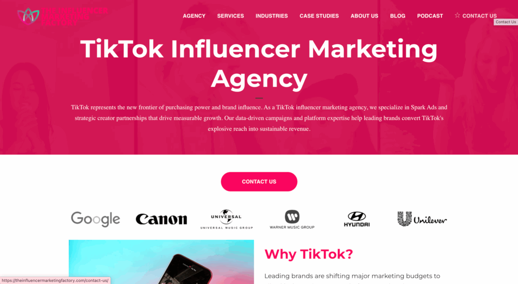 The Influencer Marketing Factory es una agencia global de Marketing de Influencers en TikTok, con presencia internacional. Su especialización es transformar el alcance masivo de TikTok en crecimiento medible e ingresos sostenibles para marcas líderes.