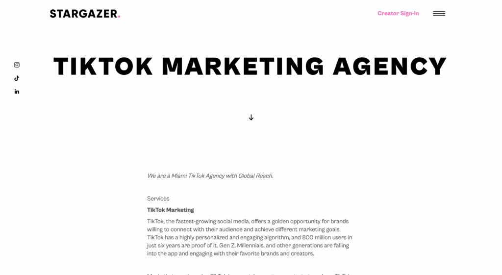 Stargazer es una agencia de Marketing de TikTok con sede en Miami y alcance global. Su enfoque principal es ayudar a las marcas a capitalizar la oportunidad que ofrece TikTok, la plataforma de crecimiento más rápido, para alcanzar objetivos de marketing como notoriedad de marca, engagement, tráfico web e ingresos, con un enfoque en un excelente ROI y ROAS.