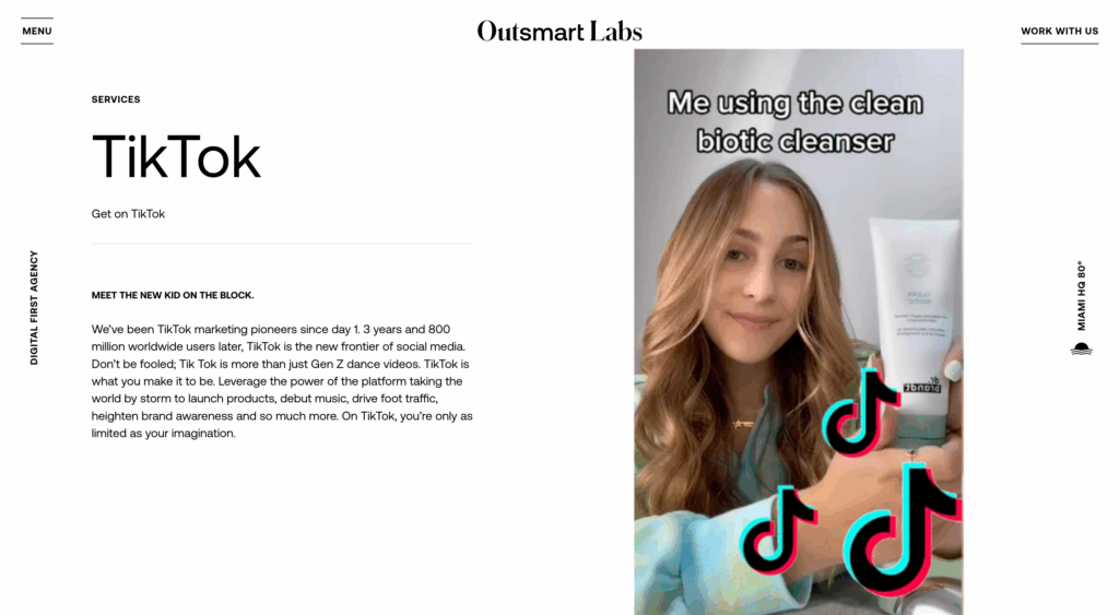 Outsmart Labs es una Agencia de Marketing Digital con sede en Miami, Florida, que se enfoca en ser pionera en el Marketing de TikTok desde sus inicios. Se posicionan como expertos en aprovechar la plataforma para lanzar productos, impulsar música, aumentar el tráfico peatonal y generar una fuerte notoriedad de marca.
